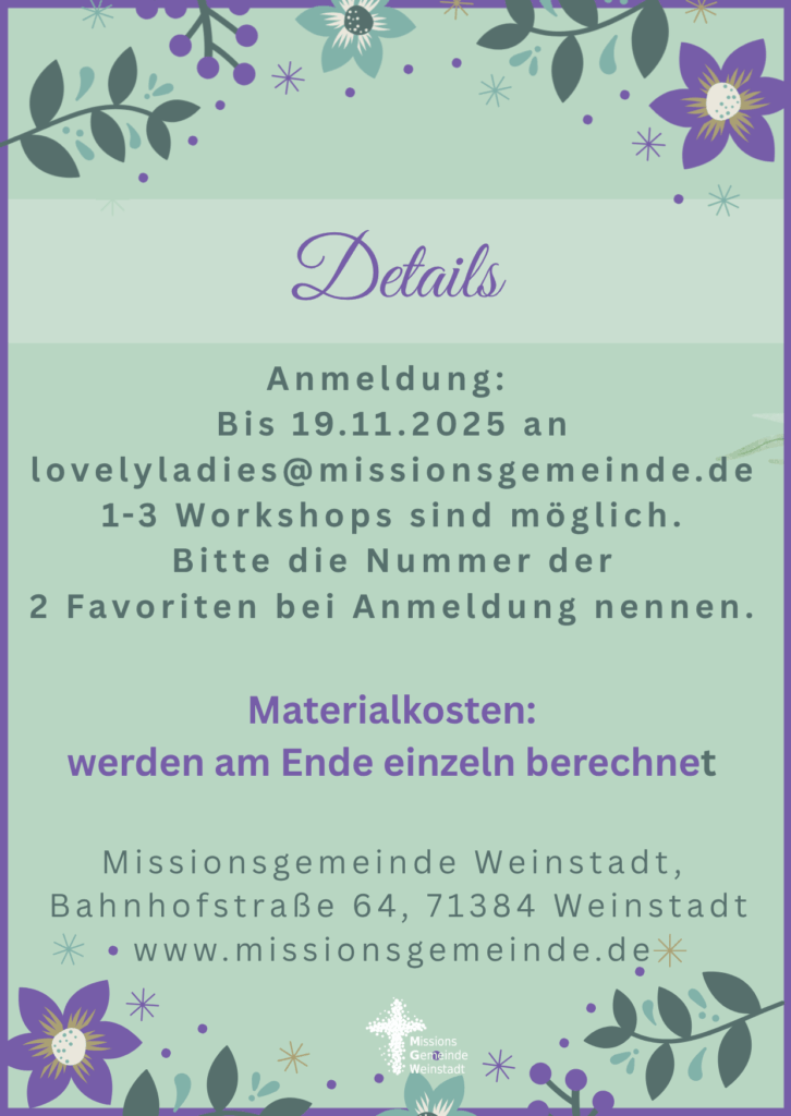 Anmeldung bitte bis 19.11.25 an lovelyladies@missionsgemeinde.de, da wir das Material besorgen müssen.
