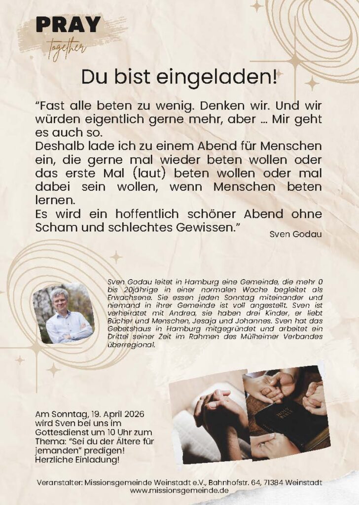 Pray together – Gemeinsam beten lernen – auch für Nicht-Beter am Sa. 18. April 2026 um 19:30 Uhr.