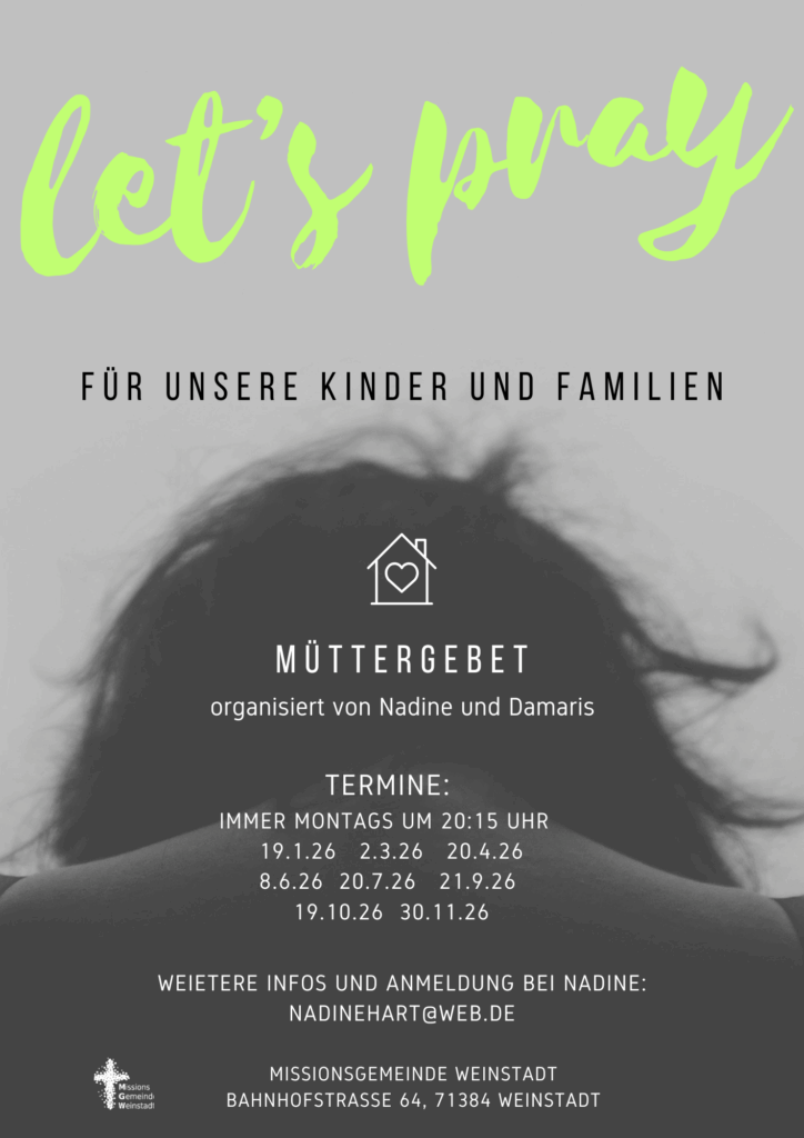 Wir würden uns sehr freuen, wenn Du auch mitbeten möchtest! Weitere Infos und Anmeldung bei Nadine:nadinehart@web.de